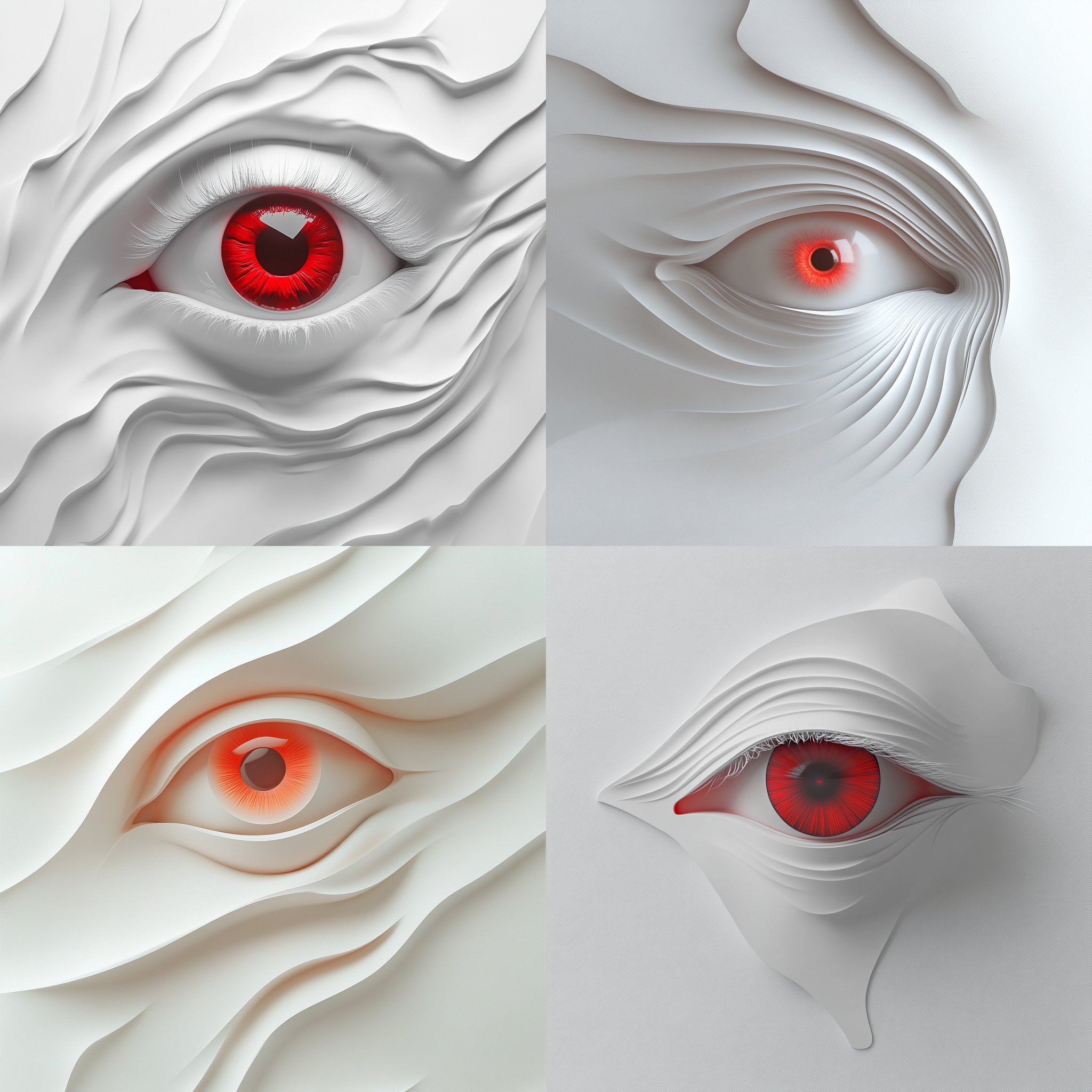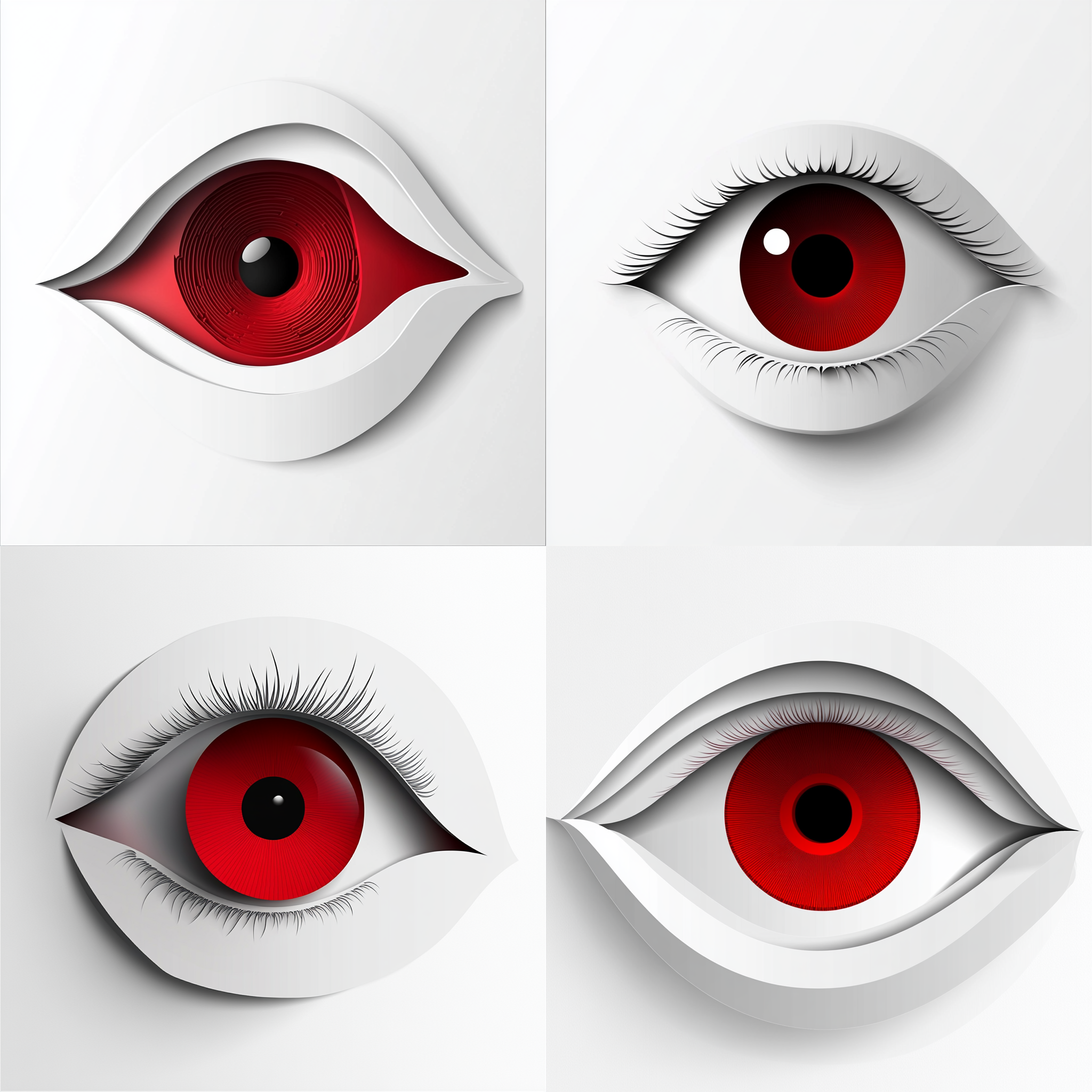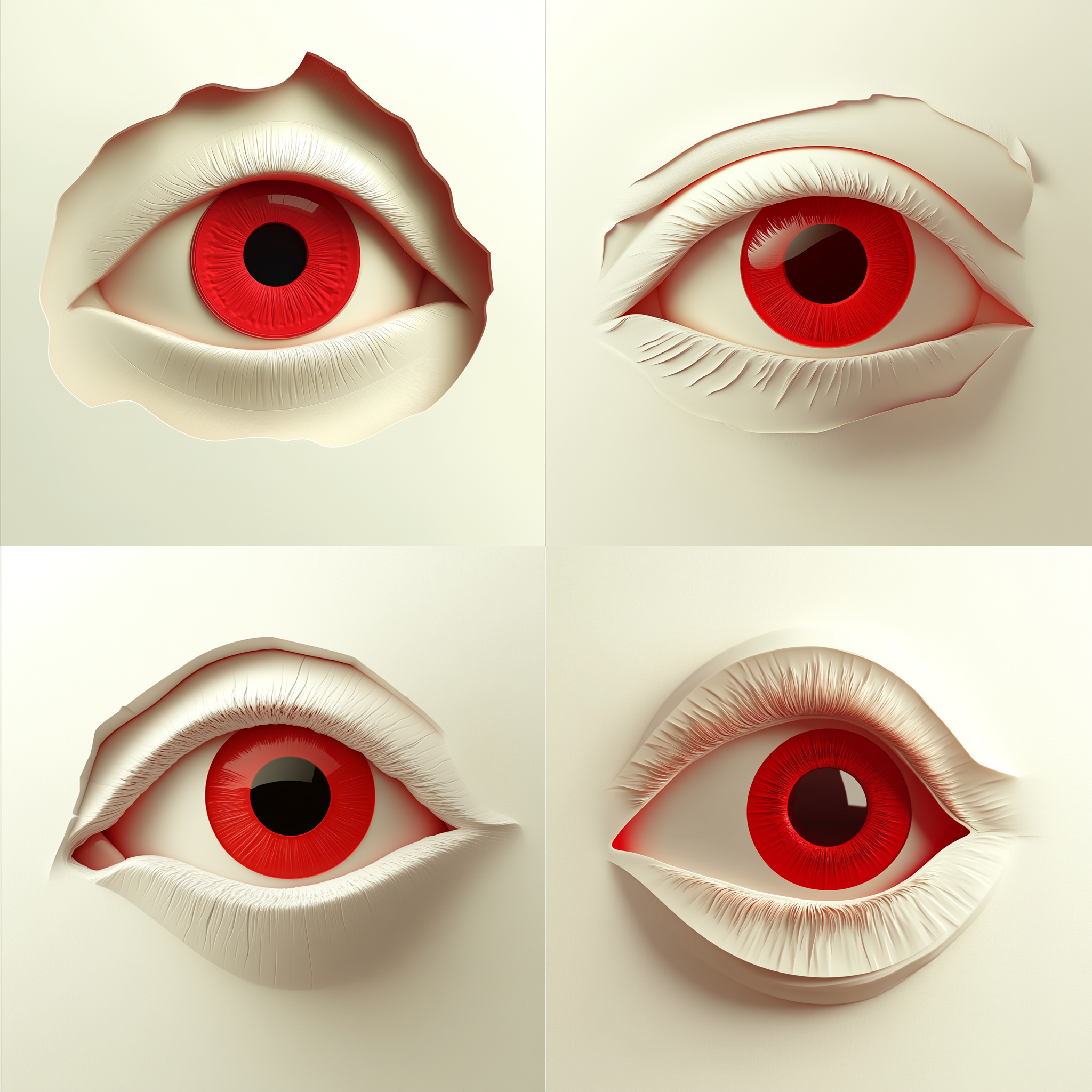 Left: 3D red eye icon, white background, white and cream color theme, simple, elegant, minimalistic design, isometric view, 2D illustration, white background, red iris, eye shape, white eyelashes, red pupil, white skin tone, front-facing | Middle: 3D vector graphic of an eye, red iris on a white background, paper-cut style, symmetrical design, centered composition, simple design, no text or letters in the picture, no lettering. | Right: Minimalist surreal eye, seamlessly blending into a soft white background, embossed relief effect, smooth 3D rendering, soft shadows, hyperrealistic yet abstract, futuristic sculpture, fluid organic form, paper cutout aesthetics, monochromatic with a striking red iris, ultra-detailed, Octane render, soft lighting, subtle gradients, cinematic composition