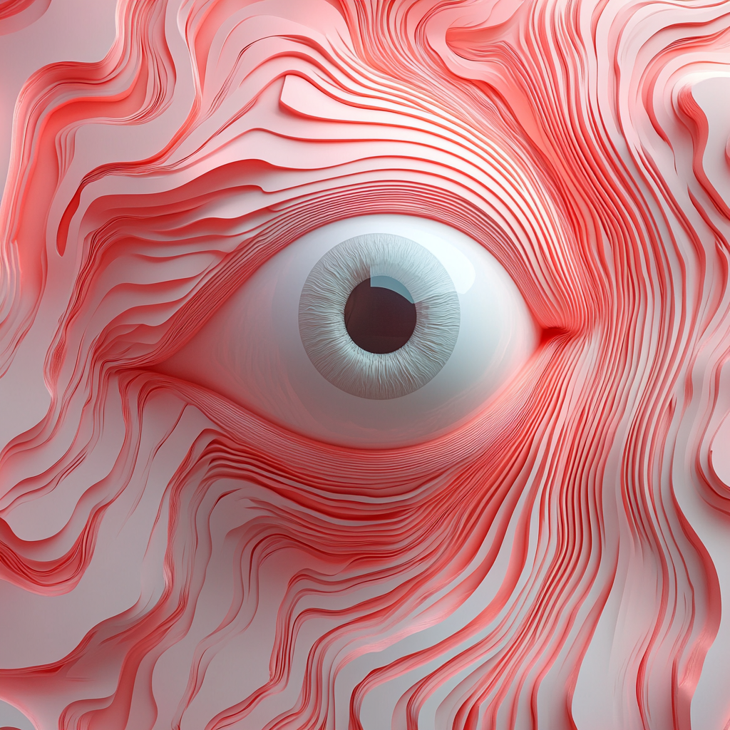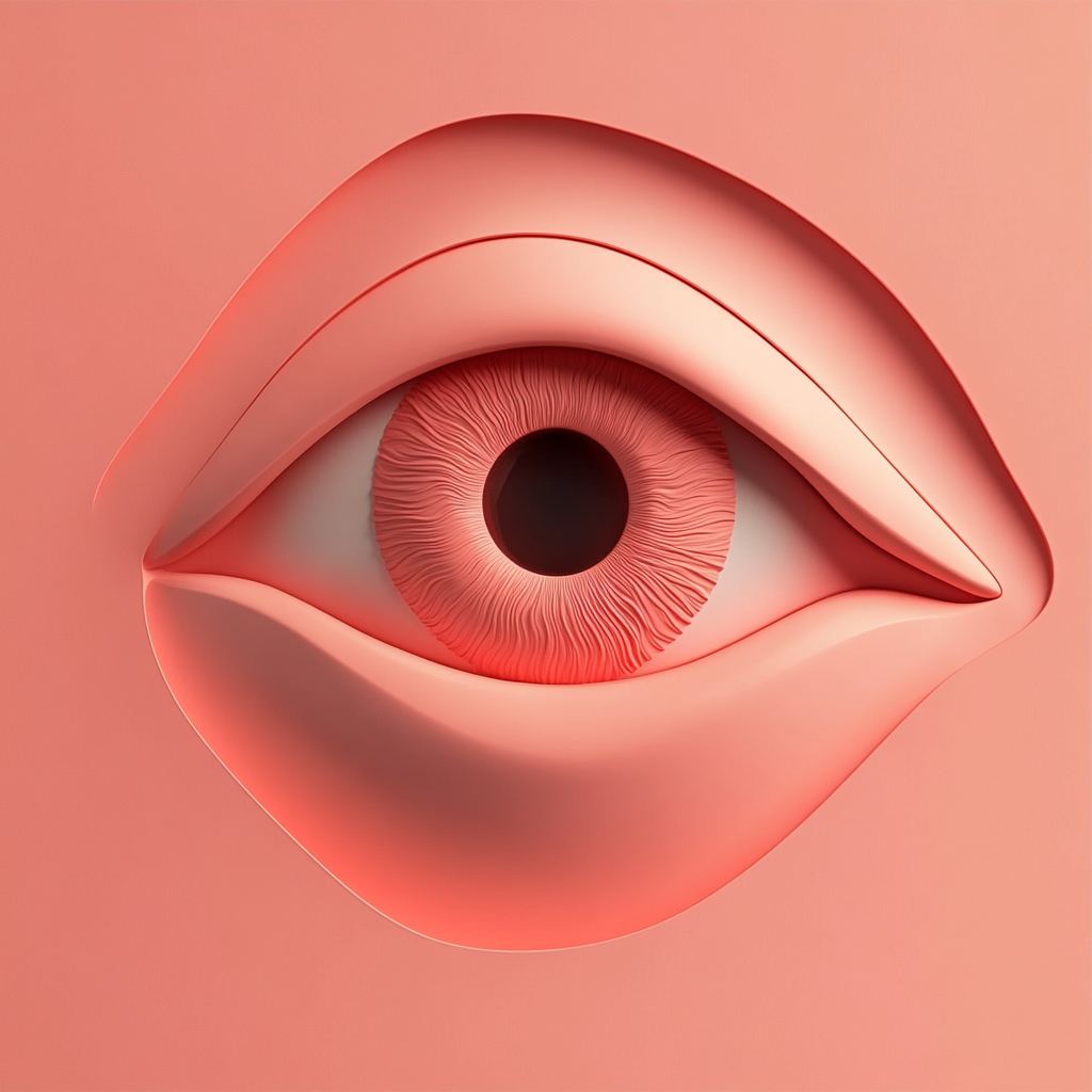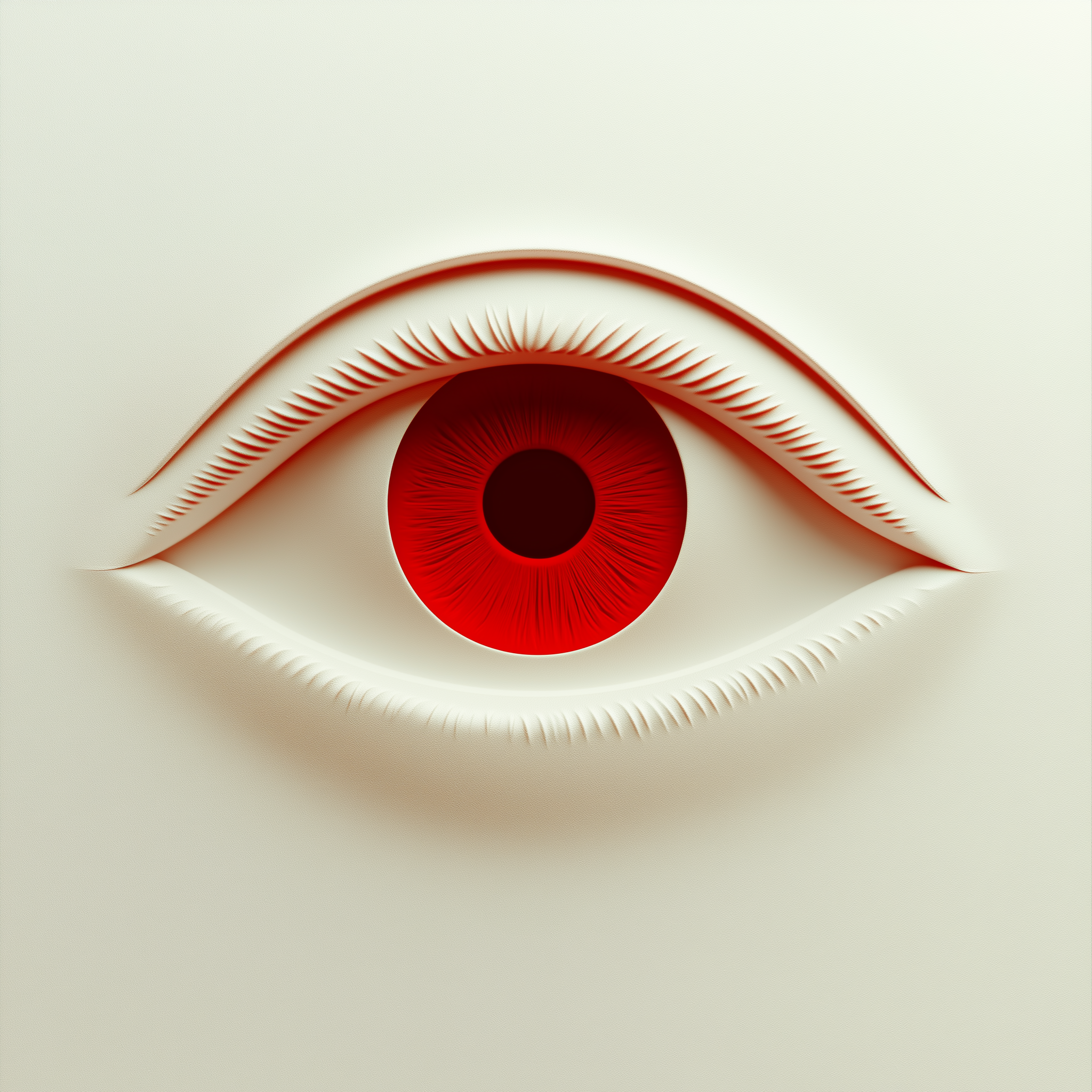 Left: 3D red eye icon, white background, white and cream color theme, simple, elegant, minimalistic design, isometric view, 2D illustration, white background, red iris, eye shape, white eyelashes, red pupil, white skin tone, front-facing | Middle: 3D vector graphic of an eye, red iris on a white background, paper-cut style, symmetrical design, centered composition, simple design, no text or letters in the picture, no lettering. | Right: Minimalist surreal eye, seamlessly blending into a soft white background, embossed relief effect, smooth 3D rendering, soft shadows, hyperrealistic yet abstract, futuristic sculpture, fluid organic form, paper cutout aesthetics, monochromatic with a striking red iris, ultra-detailed, Octane render, soft lighting, subtle gradients, cinematic composition