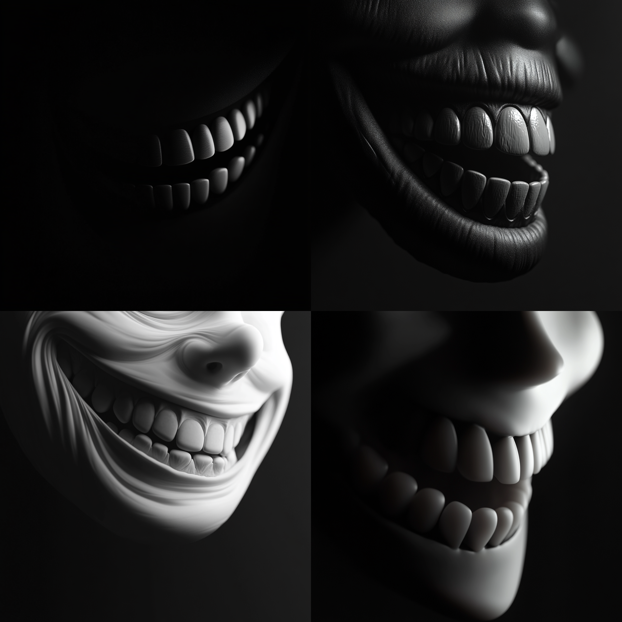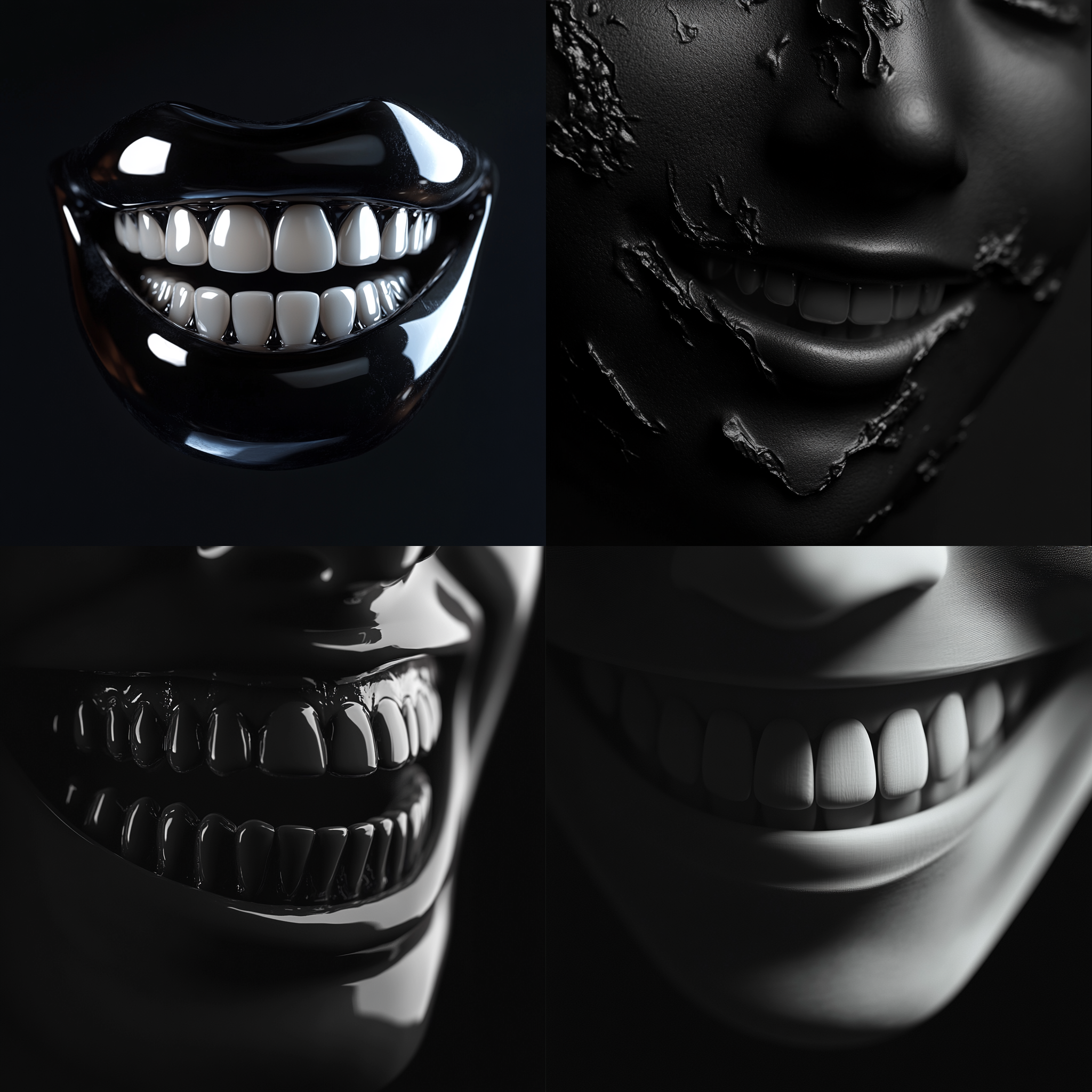 Left: Minimalist surreal grin, seamlessly blending into a soft black background, embossed relief effect, smooth 3D rendering, soft shadows, monochromatic, Octane render, soft lighting, subtle gradients, cinematic composition | Middle: 3D illustration, A close-up of the tongue and lips, rendered in black, designed to resemble an animated character's mouth. The background is dark gray, creating contrast that highlights both parts of the face. This minimalistic design emphasizes just these two elements. | Right: Minimalist grin, seamlessly blending into a soft black background, embossed relief effect, smooth 3D rendering, soft shadows, monochromatic, Octane render, soft lighting, subtle gradients, cinematic composition