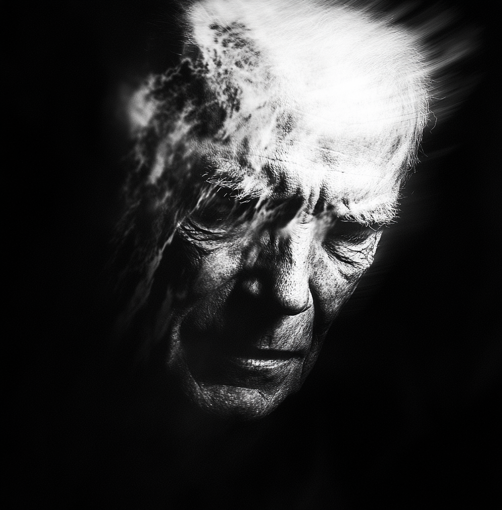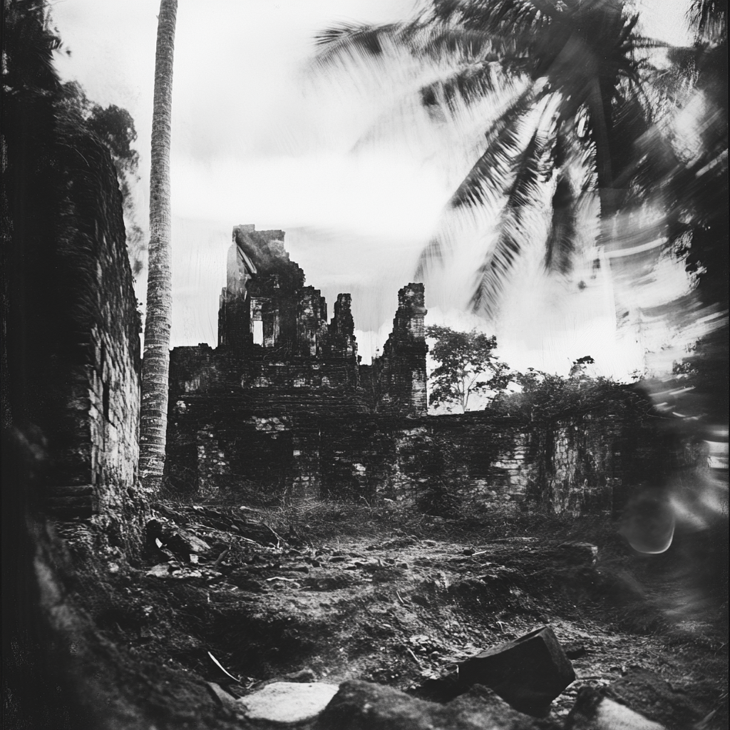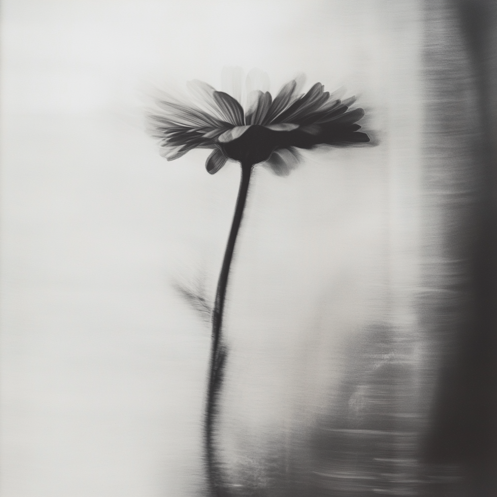 Left: Grainy black-and-white photograph, distorted blur subject: still life of a single flower | Middle: A grainy black-and-white photograph with a distorted motion blur effect, subject: shadowed face of an old man in dark, blurry and out of focus | Right: Grainy black-and-white photograph, distorted blur subject: tropical landscape with old ruins