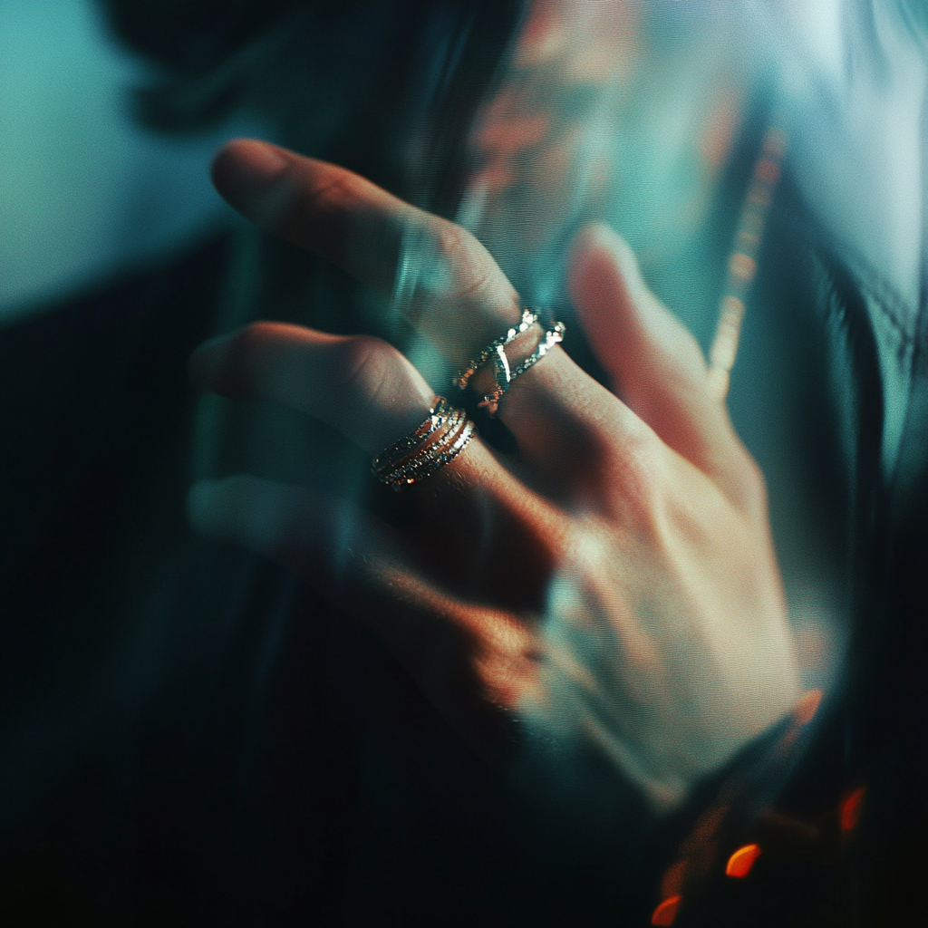 Left: Grainy photograph, distorted motion blur, subject: close up of young woman face | Middle: Photograph, distorted blur, studio light subject: jewelry on male hand | Right: Photograph, distorted motion blur, studio light subject: necklace woman