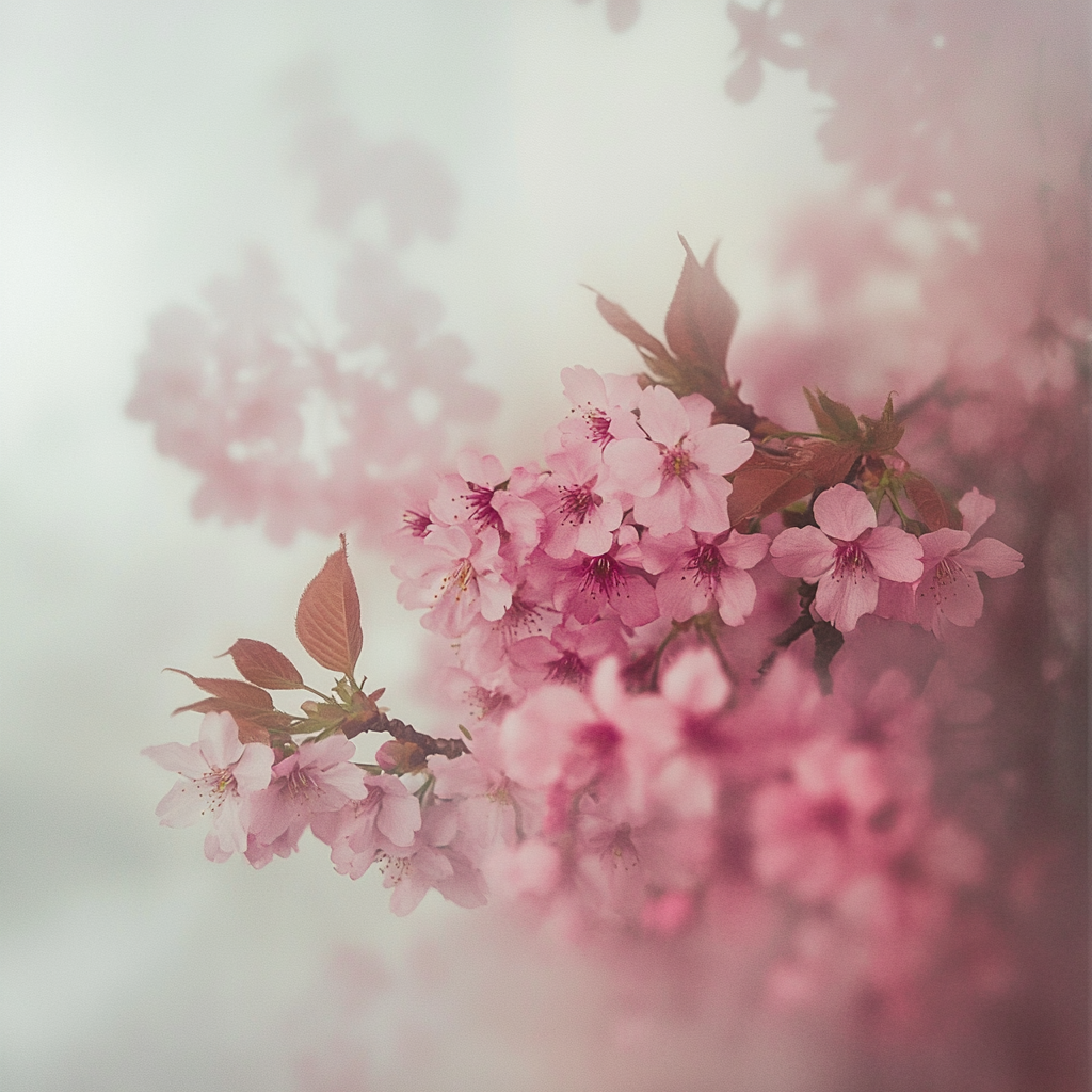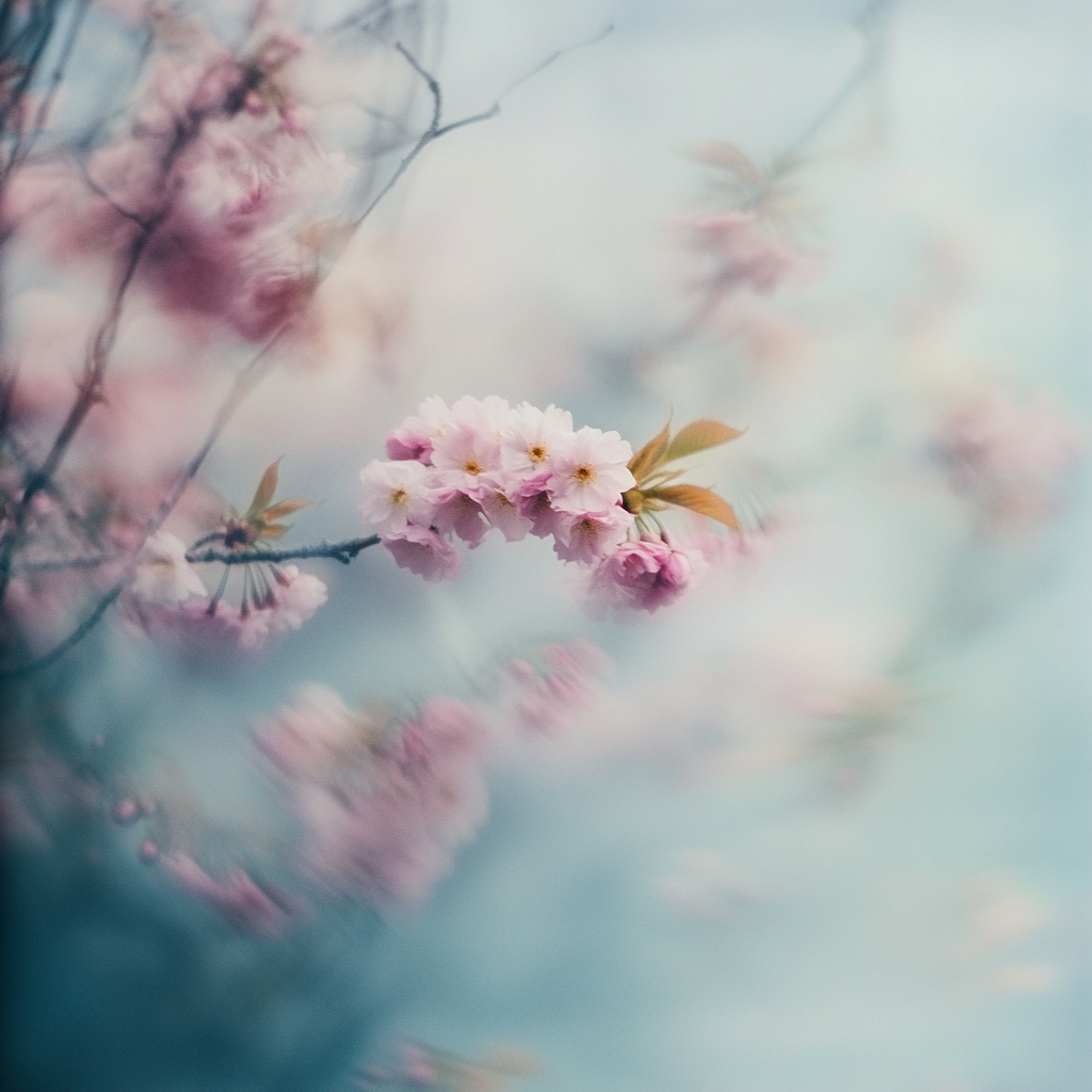 Left: Photograph, gaussian blur, subject: cherry tree blossoms, ethereal vibes, haze | Middle: Photograph, gaussian blur, subject: cherry tree blossoms, ethereal vibes, haze | Right: Photograph, gaussian blur, subject: dreamy spring day, ethereal vibes