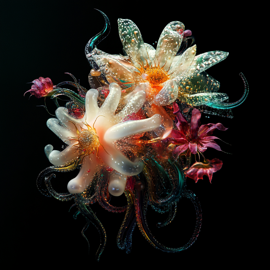 Translucency shines (literally) when applied to organic, fluid shapes. Think drifting jellyfish, delicate silk, or futuristic glass sculptures. The AI loves turning these into glowing, weightless forms that feel straight out of a sci-fi dream.
