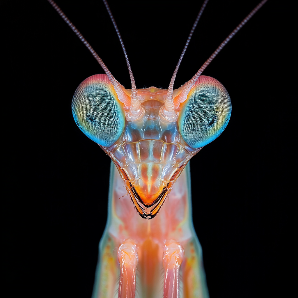 Left: photorealistic, translucent subject: a mythical underwater creature, black background | Middle: Photorealistic, translucent subject: a symmetrical mantis, black background, macro photography of the head and neck | Right: Photorealistic, translucent subject: Abstract flower, with tentacles, white background